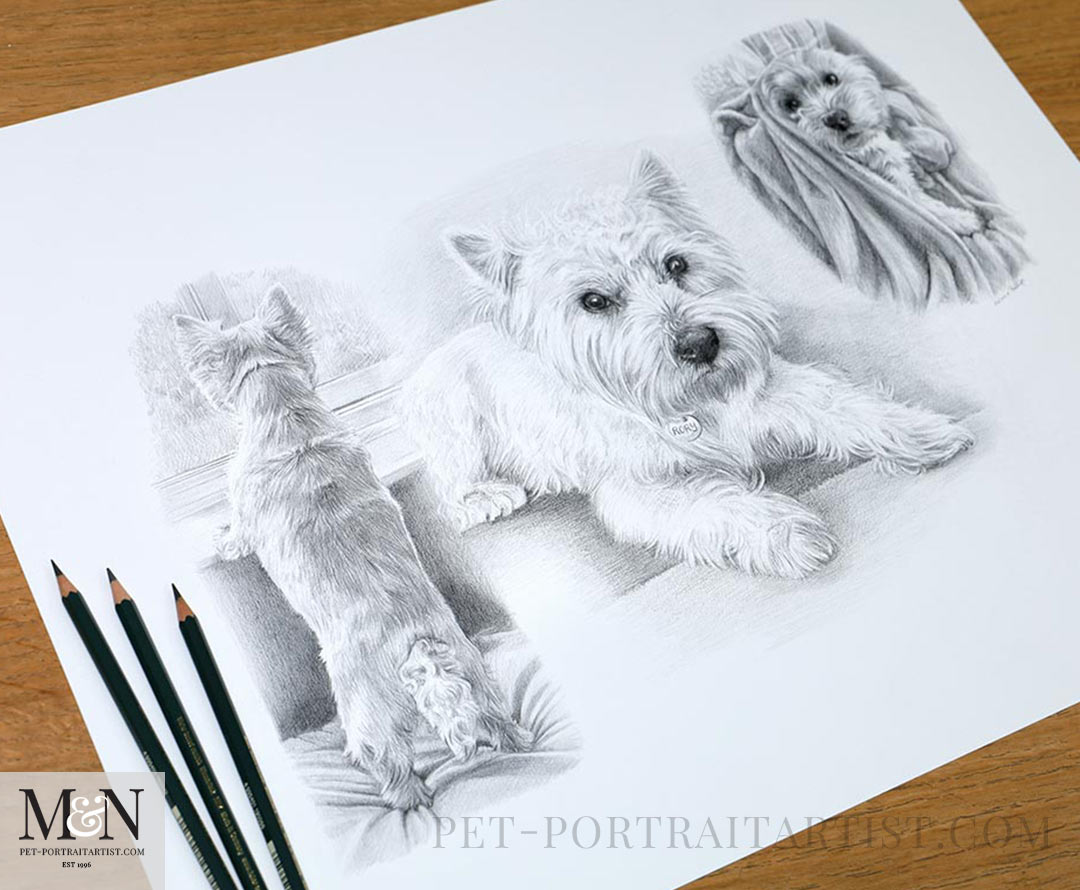 For example, we offer everything from head only pencil drawings right through to full body oil paintings in natural outdoor settings. As you have seen above, we even create montage drawings that tell the story of your pet’s life showing them across different ages or with their favourite toy. I think its always important to chat to the artists and give them your ideas as it’s much easier for us to have something to work on when looking at your photos.