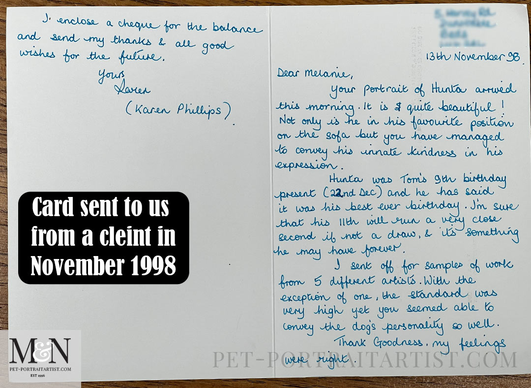 Gone are the days of hand written letters sadly. Everything is digital, but here is a card written by one of my clients in 1998. Pretty much 26 years ago to the month. As you can read back then there were no online payments as we didn’t know what ‘online’ was! All done by old fashioned cheques!