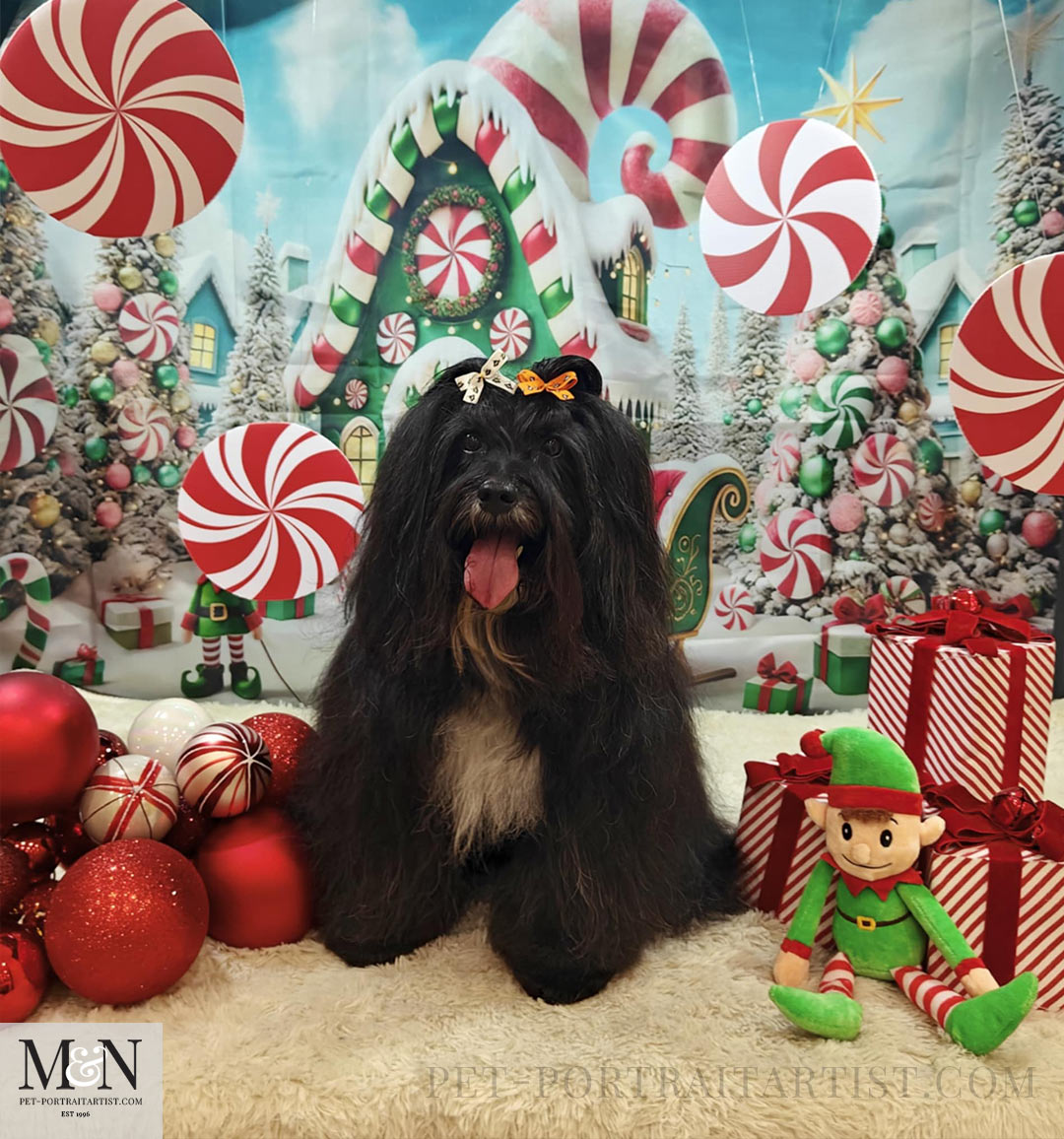 We know what it means to love a pet like family, because we do too. Lily is our Tibetan Terrier, and she’s very much the heart of our home and the studio supervisor. Creating portraits for others always brings Lily to mind. We know how much they mean and we treat every portrait with the same care we would give if it were Lily herself. This is Lily at the groomers, on a very festive background!