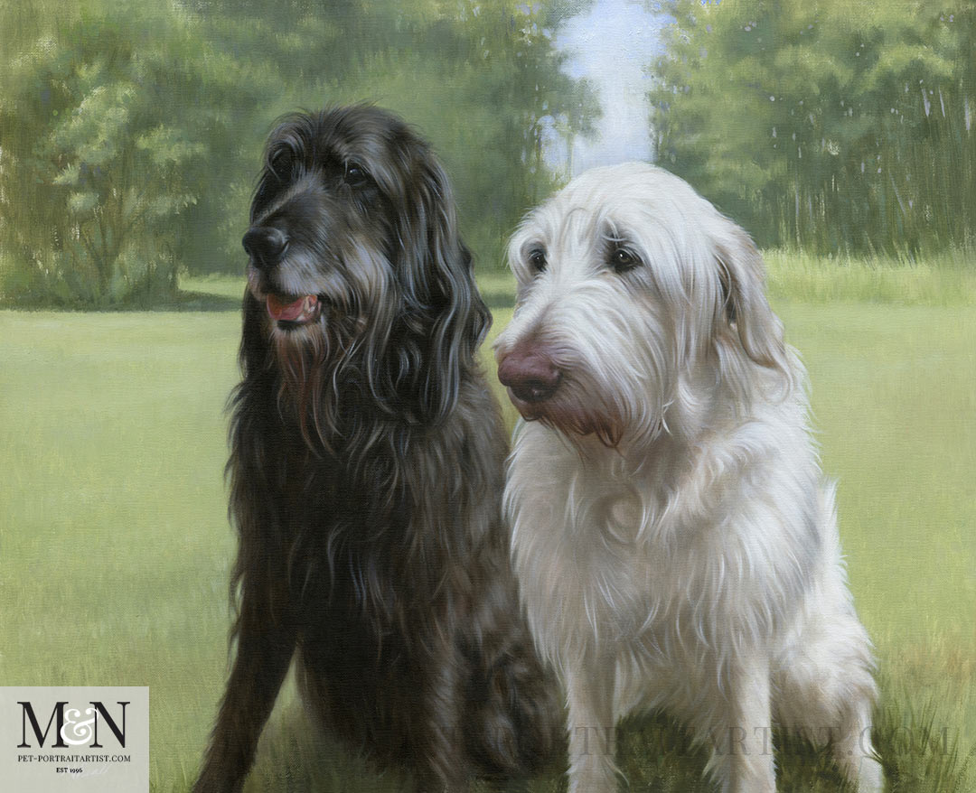A good example of this is the oil painting of Oscar and Harry. Having spoken at length to our client, we found that ideally they wanted a full body or half body of their dogs, sat together in their garden with their favourite pear trees in the background. So we set them to work taking plenty of photos of the dogs and their garden on a sunny day and we brought everything together for them, for their perfect painting and perfect view.